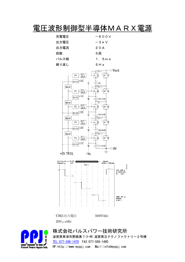 本装置は半導体スイッチであるMOS-FETを多数使用することにより、下記の高電圧パルスを安定に発生します。